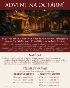 Přijďte si během adventních víkendů užít vánoční atmosféru s rodinou či přáteli v srdci Kroměříže – na nádvoří Octárny.