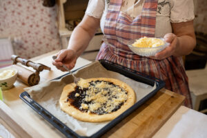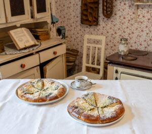 2 Národopisná oblast Haná je od nepaměti spjata s rozlehlými rovinami a úrodnými poli. Zdejší úrodnost a bohatství se promítly nejen do lidových zvyků a pestrobarevných krojů, ale i do gastronomických tradic, ke kterým se hrdě hlásí i Kroměříž. Základ hanáckého jídelníčku tvořily kaše, polévky a především lahodné omáčky, ze sladkých jídel pak jednoznačně vedou nejrůznější buchty a koláče. A právě pověstný hanácký vdolek se stal jedním ze symbolů Hané. „Vdolek je pečené nebo smažené pečivo z kynutého těsta kulatého tvaru. Velikost kvalita i způsob se vždy lišil regionálně, sociálně i dobově. Na Moravě to bylo lepší pečivo, které se nazývalo báleše, béleše, bochánky, bochetke nebo pagáče. Nejstarší forma vdolku je placka pečená v popelu či rozpálených kamnech. Naše babičky a prababičky pekly kynutý bochánek v peci. Na Hané se pekly bochetke. Tyto kynuté vdolky se pekly později i v troubě na jedné straně nebo na plátech sporáku oboustranně,“ prozradil Petr Hlavačka, etnograf Muzea Kroměřížska. Haná byla a je úrodným krajem, proto naši předkové při vaření a pečení nešetřili. Hanácké vdolky však nebyly běžným jídlem, pekly se jen při slavnostních příležitostech, svátcích, dožínkách nebo na neděli. Tradiční varianta z kynutého těsta je plněná tvarohem, potřená švestkovými povidly a posypaná drobenkou. Recept na Kroměřížský vdolek 500 g hladké mouky, 100 g cukru, 40 g droždí, 3 žloutky, 100 ml oleje, 250 ml mléka, citrónová kůra, špetka soli, 1 lžíce rumu, švestková povidla Tvarohová náplň: 300 g tvarohu, 80 g cukru, 3 žloutky, rozinky, citrónová kůra Drobenka: 100 g másla, 100 g cukru, vanilkový cukr, 100 g mouky polohrubé Z mouky, mléka, droždí, cukru, žloutků, oleje, citrónové kůry a špetky soli připravte polotuhé těsto, které nechte vykynout. Vykynuté těsto pak rozdělte na 4 díly, ty rozválejte na menší placky. Do každé zabalte čtvrtinu náplně a vyválejte z těsta kulatý koláč asi 25 cm v průměru. Potřete jej povidly a posypte drobenkou. Pečte při střední teplotě, aby se koláče nespálily a dobře propekly. Okraje potřete rozšlehaným vajíčkem nebo máslem. Upečené krájíme na klínky jako dort.HANÁCKÝ VDOLEK NECHYBĚL NA ŽÁDNÉ SLAVNOSTI