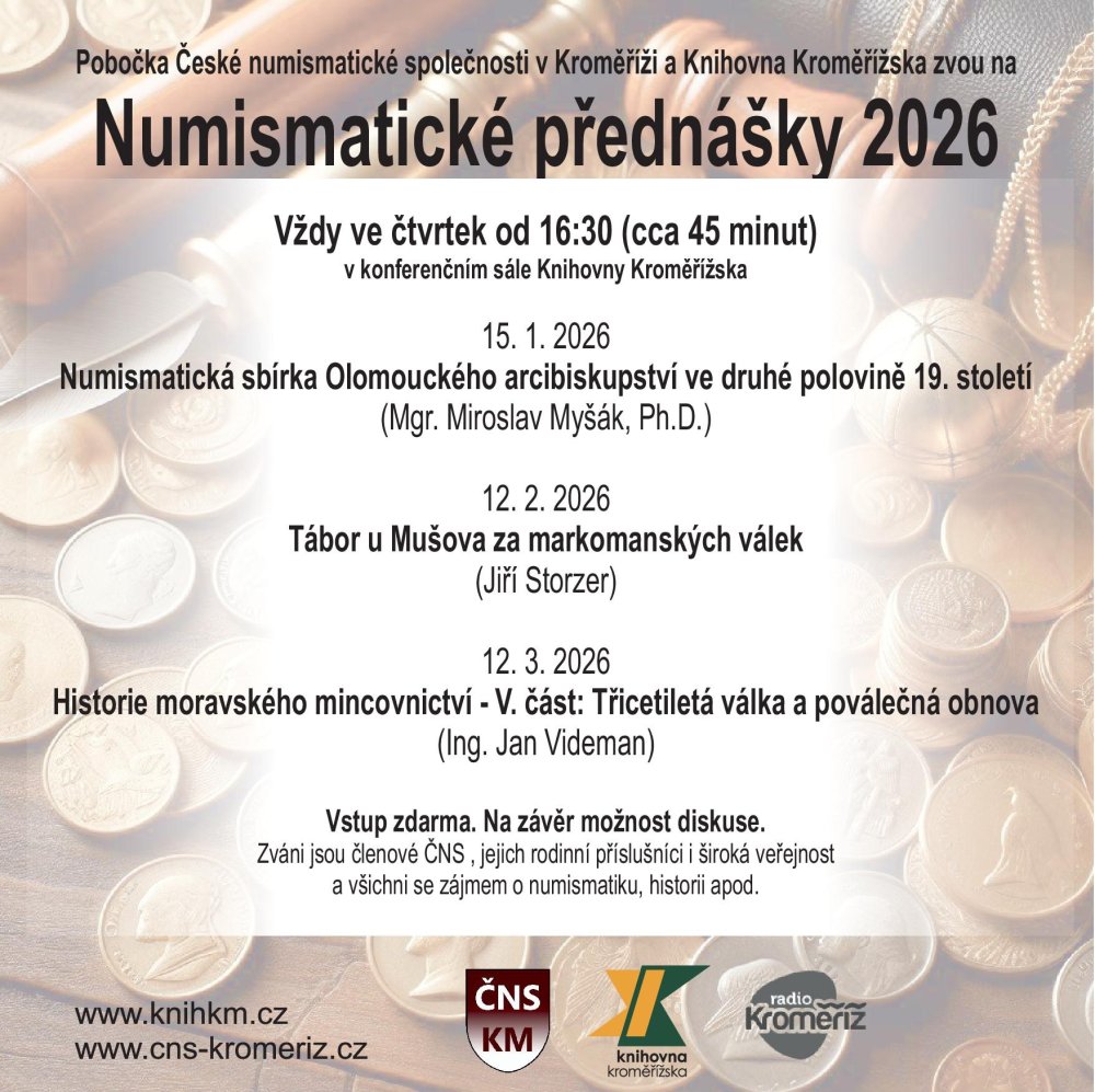 Pořádá Pobočka České numismatické společnosti Kroměříž ve spolupráci s Knihovnou Kroměřížska. Z cyklu Numismatické přednášky.