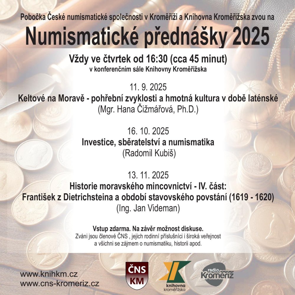 Přednáška člen Pobočky české numismatické společnosti v Kroměříži. Ve spolupráci s Knihovnou Kroměřížska.